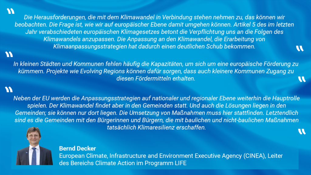 Danach folgte ein Input von Bernd Decker (European Climate, Infrastructure and Environment Executive Agency (CINEA)), Leiter des Bereichs Climate Action im EU-Förderprogramm LIFE. Herr Decker gab einen Überblick über die europäischen Bemühungen dem Klimawandel Anpassungsmaßnahmen gegenüber zu stellen und setzte sie in den Kontext zum LIFE Programm. Die Präsentation von Herrn Decker finden Sie hier: