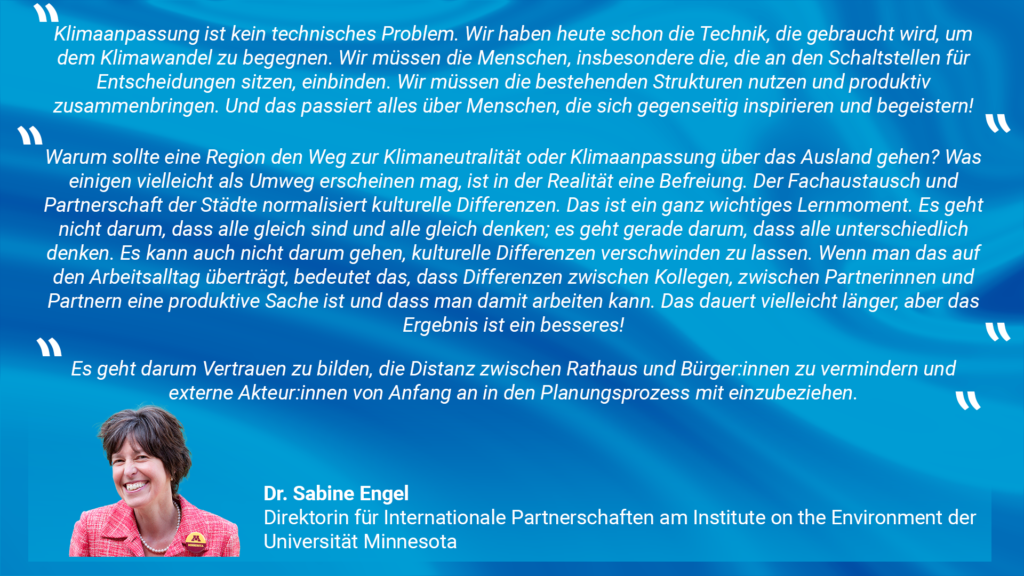 Dr. Sabine Engel brachte eine andere Perspektive in die Runde und erzählte in Ihrem Vortrag von den Erfahrungen aus der Zusammenarbeit zwischen Minnesota und NRW. In dem Projekt „NRW-Minnesota Climate-Smart Municipalities“ wurde insbesondere deutlich, dass die Kompetenzen der Menschen und der Austausch zwischen ihnen gefördert werden müsse. Voneinander lernen stehe hier im Vordergrund. Gleichzeitig müsste im Prozess deutlich werden, wer die Entscheidungshoheit für Klimaanpassung innehat und welche Akteur:innen und Stakeholder integriert werden müssen. Für weitere Informationen können Sie hier die Präsentation von Frau Dr. Engel einsehen: