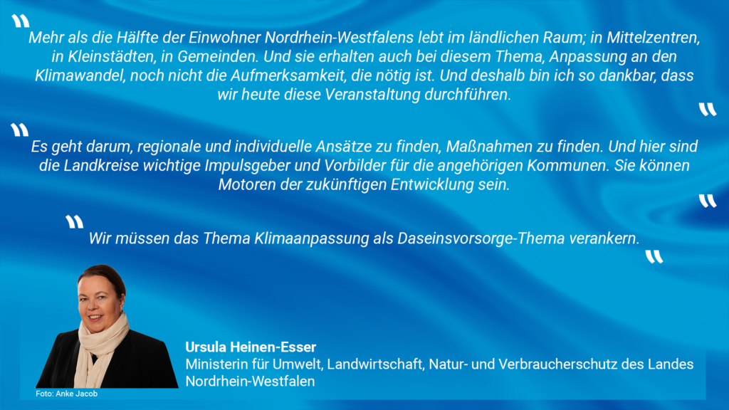 Mehr als die Hälfte der Einwohner Nordrhein-Westfalens lebt im ländlichen Raum; in Mittelzentren, in Kleinstädten, in Gemeinden. Und sie erhalten auch bei diesem Thema, Anpassung an den Klimawandel, noch nicht die Aufmerksamkeit, die nötig ist. Und deshalb bin ich so dankbar, dass wir heute diese Veranstaltung durchführen.