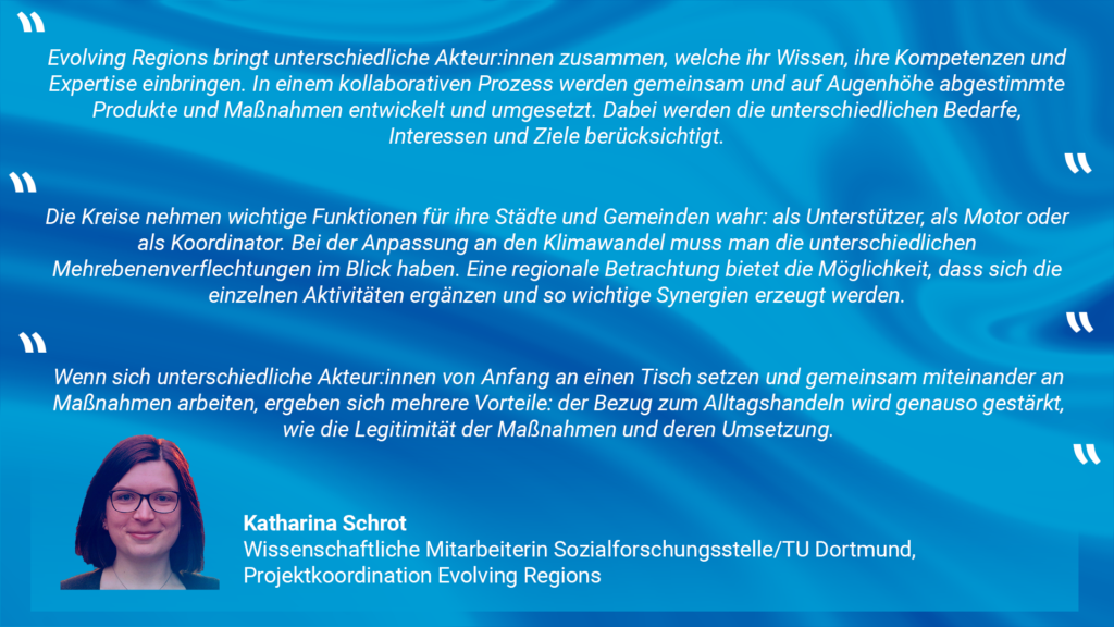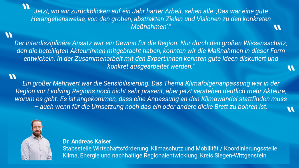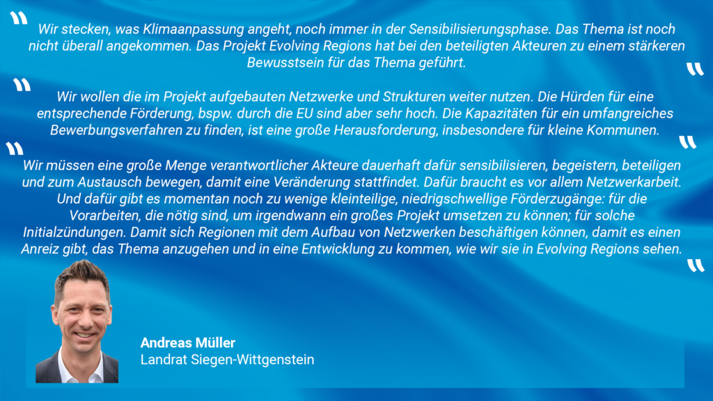 Ein großer Mehrwert war die Sensibilisierung. Das Thema Klimafolgenanpassung war in der Region vor Evolving Regions noch nicht sehr präsent, aber jetzt verstehen deutlich mehr Akteur:innen, worum es geht. Es ist angekommen, dass eine Anpassung an den Klimawandel stattfinden muss – auch wenn für die Umsetzung noch das ein oder andere dicke Brett zu bohren ist