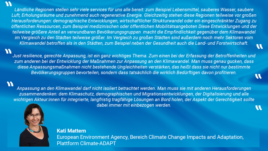 Im Rahmen der Podiumsdiskussion wurde aus den unterschiedlichen Blickwinkeln der Diskussionsteilnehmenden auf die Rolle und die Bedarfe von ländlichen Regionen in der Klimaanpassung geblickt. Die Diskussionsteilnehmenden waren sich einig, dass die Auswirkungen des Klimawandels nicht an den örtlichen Grenzen haltmachen und so die Notwendigkeit einer abgestimmten Handlungsstrategie auf regionaler Ebene bestehe. Die Kreise können dabei als Unterstützer, Koordinator oder Motor für ihre kreisangehörigen Städte und Gemeinden dienen und so Synergien schaffen. Weiterer Bedarf wird bei der Sensibilisierung gesehen, eine Möglichkeit auch auf übergreifende Daten und Beispiele aus anderen EU-Ländern zuzugreifen stellt dafür die Online-Wissensplattform Climate-ADAPT dar. Die Diskussionsteilnehmenden waren sich außerdem einig, dass Klimaanpassungsaktivitäten in ländlichen Regionen eine langfristige Finanzierung benötigen, dessen Beantragung auch für kleinere Kommunen und Kreisen durch unkompliziertere Antragsverfahren ermöglicht werden sollte.