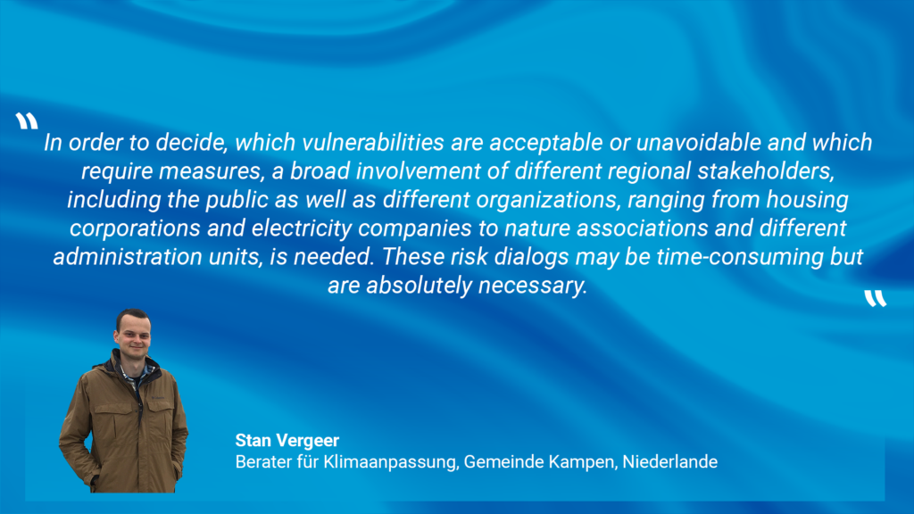 Stan Vergeer gab in seinem Vortrag einen Überblick über Klimaanpassung in der West-Overijssel, mit einem speziellen Blick auf die RIVUS Region in den Niederlanden. Bei seinem Vortrag wurde die nationale Ausrichtung der Niederlande mit einem umfassenden Programm zur Verpflichtung zur Klimaanpassung deutlich. Herr Vergeer ging auf die für ihn drei relevanten Schritte aus der nationalen Klimaanpassungsstrategie in der RIVUS Region ein. Im ersten Schritt wurde ein Stresstest durchgeführt, in dem die regionalen Gegebenheiten und die Folgen des Klimawandels gegenübergestellt wurden. Als relevanten zweiten Schritt sieht Herr Vergeer die Durchführung eines Risikodialog mit allen Akteur:innen aus der Region. Auf Basis dieser Schritte wurde dann ein Umsetzungsprogramm entwickelt, in dem die verschiedenen Vulnerabilitäten festgehalten, notwendige Maßnahmen und Möglichkeiten zur Messung formuliert wurden. Die Präsentation von Herrn Vergeer können Sie sich hier herunterladen: