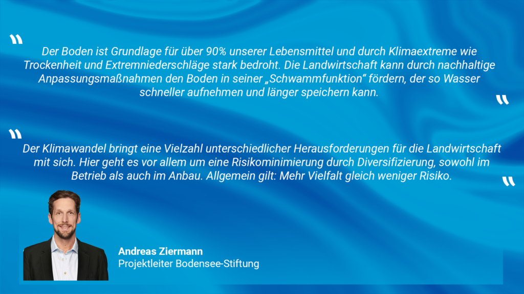 Zu guter Letzt stellte Andreas Ziermann, Projektleiter bei der Bodensee-Stiftung, die Folgen des Klimawandels und die Klimaanpassung in der Landwirtschaft vor. Dabei startete er mit der Betroffenheit für die Landwirtschaft durch den Klimawandel – wobei insbesondere der Boden durch Trockenheit auf der einen und Extremniederschläge auf der anderen Seite bedroht wird. Doch auch auf Lösungsideen wurde in dem Vortrag eingegangen, das zentrale Stichwort ist hier: Diversifizierung. Im Anschluss stellte Herr Ziermann das Projekt GeNIAL vor, welches ein Bildungsangebot zur nachhaltigen Klimafolgenaanpassung in der Landwirtschaft anbietet – in dem Projekt steht die Sensibilisierung und Qualifizierung im Vordergrund. Zusätzlich führte er kurz durch das Webtool AgriAdapt. Für weitere Informationen schauen Sie gerne hier in die dazugehörige Präsentation: