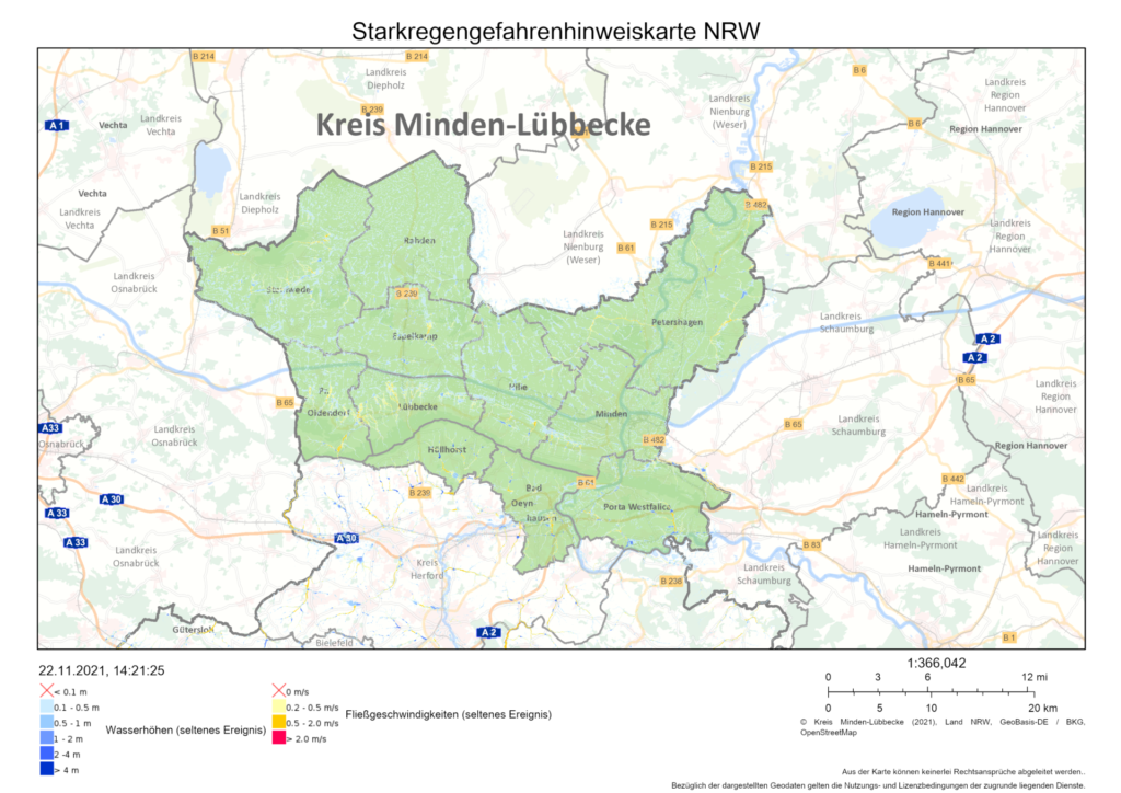 Nach den zurückliegenden Hitzesommern waren in diesem Jahr vor allem Starkregenereignisse ein großes Thema. So beschäftigen sich die Klimafolgenkarten auch mit diesem Aspekt. Der Temperaturanstieg im Zuge des Klimawandels bewirkt, dass die warme Luft mehr Wasser aufnehmen kann, starke Niederschläge nehmen zu. Starkregen heißt: viel Wasser in kurzer Zeit, er besitzt also im Verhältnis zu seiner Dauer eine hohe Intensität und kann deshalb starke Schäden verursachen, auch wenn keine Gewässer in der Nähe sind, die über die Ufer treten könnten. Um solchen Ereignissen entgegen zu wirken, ist vorausschauende Planung wichtig. Die Starkregengefahrenhinweiskarte NRW zeigt im GEOportal, wo besondere Gefahrenbereiche für Überflutungen in den kreisangehörigen Kommunen liegen. Die vom Bundesamt für Kartographie und Geodäsie veröffentlichten Modellierungen stellen die überfluteten Flächen, die Wassertiefen und Fließgeschwindigkeiten im Kreis Minden-Lübbecke dar – und dies für zwei Arten: für ein seltenes, 100-jährliches sowie für ein extremes Starkregenereignis, angenommen wird dabei jeweils eine Dauer von 60 Minuten. Für Hochwasser an Fließgewässern gibt es außerdem schon seit vielen Jahren die Hochwasser-Gefahrenkarten.