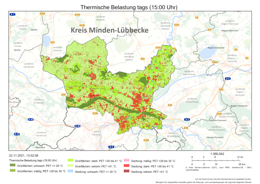 Wo schlägt zum Beispiel im Sommer die Hitze besonders zu? – Interessierte Bürgerinnen und Bürger können sich auf Basis der Klimamodellierungen des LANUV anzeigen lassen, wo es im Kreis Minden-Lübbecke eine höhere Hitzebelastung gibt. Angezeigt wird beispielsweise die thermische Belastung am Tag (15 Uhr) für Siedlungs- und Grünflächen. Ein Beispiel: In der Mindener Innenstadt wird an einem typischen Sommertag in vielen Siedlungsbereichen eine starke thermische Belastung mit PET-Werten von >35 bis 41 °C erreicht. Die physiologische Äquivalenttemperatur (PET) umfasst nicht nur die Lufttemperatur, sondern auch Luftfeuchte, Wind und Strahlung, die sich auf das menschliche Empfinden auswirken.